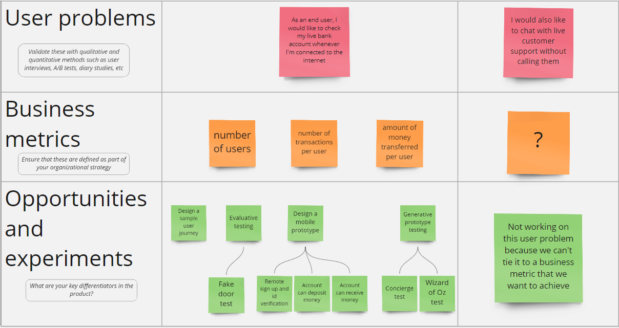 In the example above, you decide to tackle the user problem of a user being able to check their live bank account online whenever they would like, connect it to some business metrics that are included in your strategy, and think about potential experiments to try and validate your assumptions about the potential benefits of using your mobile banking app.