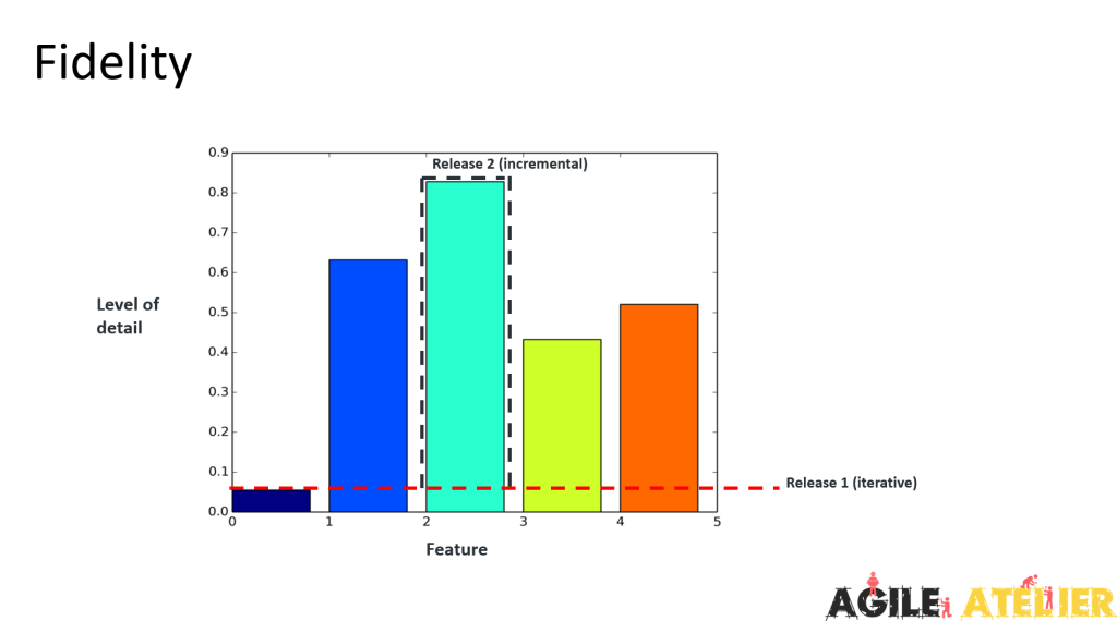 Fidelity is a concept coined by Karl Scotland that refers to the level of detail mentioned in the examples above. Not all products/features are required at a high fidelity. In the iterative release (Release 1 in the diagram above), you develop all the features to a low level of detail, because maybe just by themselves, they don’t individually bring much value. For example, if you’re building Amazon.com from scratch, you create a website with a simple landing page with Search, View, Basket, and Checkout features. After your website goes live, you realize that customers really want a Categories feature, where they can see the #1 selling products in each category and make their choices easier. Taking this feedback into consideration, within the View feature, you build the Categories feature for customers to see the most-sold products. In the image above, this is your Release 2, which is incremental for the Categories feature. Of course, you can work on a product increment, iteratively. The example above is an overly-simple one to explain the concepts in an easy-to-understand manner.