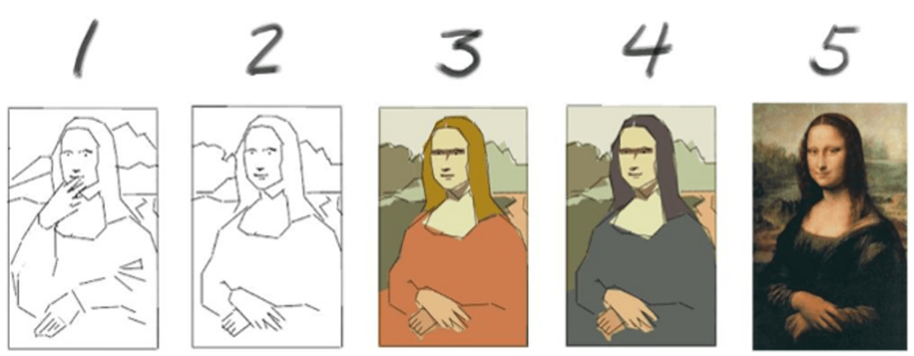In an incremental approach, you must know what the finished product should look like before you create any part of it. In the image above, it’s expensive and time-consuming to make changes. If you’d like to change the position of Mona Lisa’s hand, you would have to erase the brushstrokes, complete the hand in another position to the highest detail, and make sure that it merges with the rest of the colors in the portrait. With this approach, you must make each increment, or part, of the painting to the highest level of detail before moving on to the next increment.