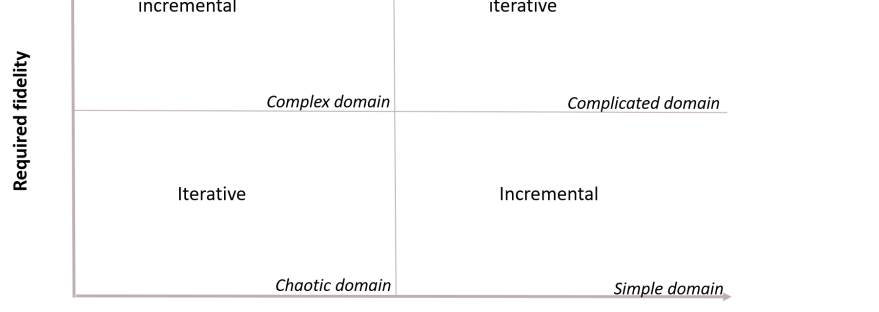 Adding Cynefin theory to the Value/Fidelity matrix results in the above. This is not to say that iterative approaches should not be used in the simple domain or incremental approaches should not be approached in the chaotic domain. As per Rule #1 above, you must also assess whether the product/service brings value in smaller standalone increments/iterations. It’s simply a heuristic that says, for example, because in the chaotic domain, the cause and effect relationships are unknown, it could make more sense to use an iterative approach and learn about the possible value/lack of value in each iteration and then build on that. Similarly, in a simple domain, you can use an iterative approach in some cases but as a heuristic it may make more sense to start incrementally because you theoretically know the value proposition the product/feature has for the customer. You can gain this information by qualitative/quantitative methods like diary studies, JTBD user interviews, split tests and statistical modeling.