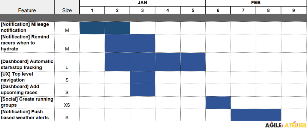 The image above shows a fixed time and scope roadmap for a team that’s building a running app to track users’ run times, races, and health stats. The development team estimates the size of the features and puts them on a roadmap. Looks nice and linear right? But what if you notice after creating the feature “Add upcoming races” that your reference users are less engaged with the app and not using either of those features? Would you continue building more socially-themed features such as “Create running groups”?