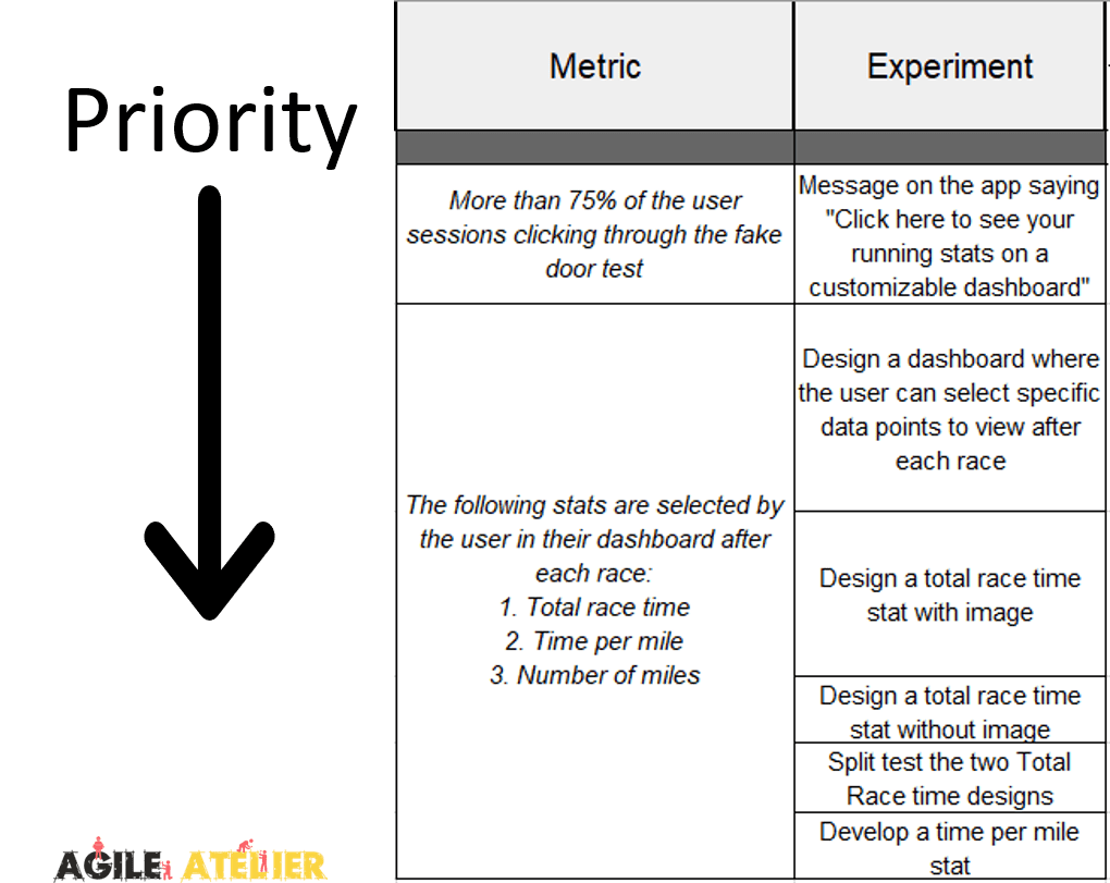 In the image above, you want to focus on prioritizing the user problems that fit into your business needs as well as their related metrics, rather than trying to estimate exactly how long it would take. Even if you do somehow manage to accurately estimate how long it would take to conduct certain experiments, there is no added benefit. You should not move on to further features/experiments without allowing the learnings from certain experiments to impact what you’re going to do in subsequent experiments. Then, for the problem, build a potential solution with the least level of required fidelity to see if that solution helps you reach your metric. But if you don’t achieve your metric, how do you know whether to stop experiment or persist with further experiments? This is where the Additional Completion Criteria come in; this column gives more detail about when you should stop your experimentation should they fail to move the needle of the related metric(s). It should be filled in with different customers of yours, to create buy in from them. This creates further alignment for the team to know the best-case and worst-case impacts of their backlog experiments rather than continuing failed experiments into infinity. Below is what a sample backlog can look like – with experiments and epics to build based on the first two metrics that you want to impact, in this case. The experiments can then be broken down into more granular tasks with something like user story mapping.