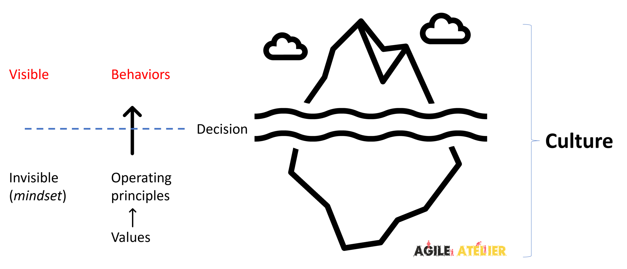 The Culture Iceberg above depicts the relationship between values, operating principles, and behaviors. Using the metaphor of an iceberg, the values and operating principles are invisible but important starting points for creating the desired behavior, which is visible to all members of the organization and beyond. The invisible portion of the iceberg can also be referred to as mindset, and the water-line is the point at which decisions are made on how individuals act and manifest their thoughts and beliefs.