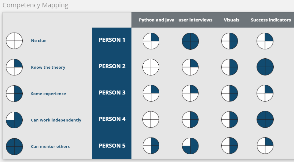 Let’s say for our app that includes coding in Python and Java, setting up and conducting user interviews, creating and adjusting visuals on the app, and creating and measuring different indicators of success of the product. - Once you’ve listed those skills that would be needed, map them to the existing roles that you have in the team. How competent are the individuals across the different skillsets? Use the five levels highlighted below between “no clue” to “can mentor others”.