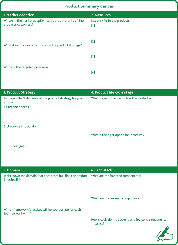 Use the product summary canvas below to get a bird’s eye view of the building blocks of your product and see if any of those pieces need to be created or modified.
